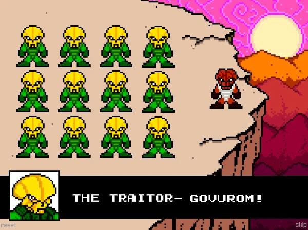 "Halt! What's this?" ordered presumably the squad leader of the LSA troop. "Show yourself!" he quickly added. Govorum let his cloak slip off with wind and reveal his full stature before them. They knew who he was. "The Traitor - GOVUROM!"