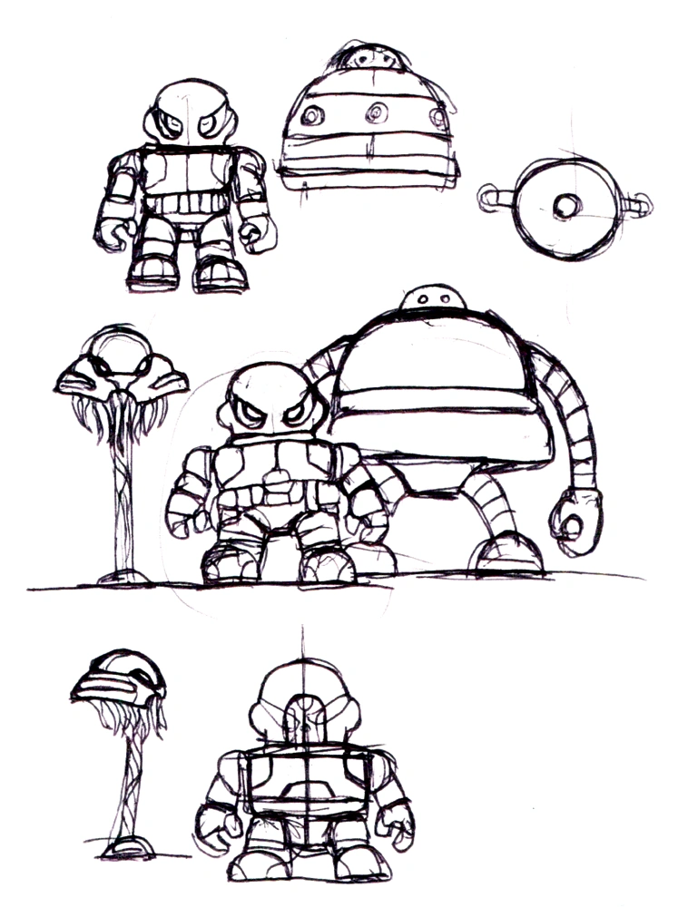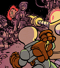The odd floating mechanical head up there is a character named Gloot, another weirdo who's part of Noboto's crew. That long strand of junk coming from beneath it was supposed to serve as a potential stand for a toy version. Both Michelle and I want to see old Gloot make an appearance as an actual toy at some point, even though he's just a little saucer head!"[2]