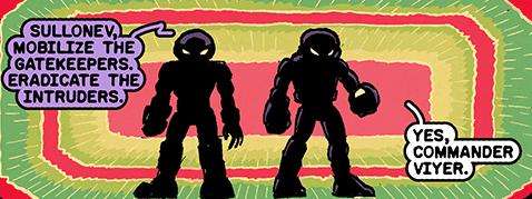 Outside, the ships drifted in eerie silence. VNNNNN... The humming of a warp channel was unmistakable. Silhouettes of two Travelers appeared in the warp light. "Sullonev, mobilize the Gatekeepers. Eradicate the intruders." the first dark shape ordered. "Yes, Commander Viyer." replied the second mysterious guest.
