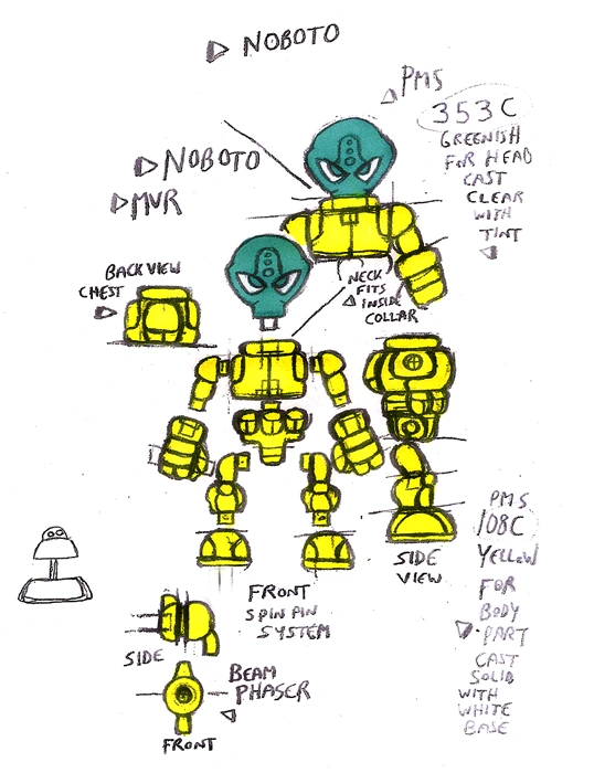 "Noboto saw a decent amount of changes during the early days of his toy form development, initially materializing as a more compact little guy with some less bulb-like head designs (although the ones in the above drawing did inspire the current Noboto's alternate Clone noggin).