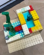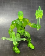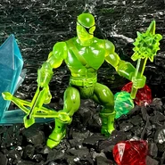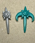 The resin parts for the figure were all made practically. No digital scanning or printing. I did an old school shrink mold with Mold Star 15 silicone and some mineral spirits. The goal was to shrink the original figure head by 20-25% and honestly it was just a good guess. Once I had it, I dremeled into the bottom neck and glued in a Glyos switchpin making sure it would fit snug and center into a Battle Tribes figure. This took some time to perfect. The crossbow was also shrunk at the same ratio with a Battle Tribes sword handle glued into the bottom. For the Crystal Viewer, I knew an original one (even shrunk) wouldn't fit into a Battle Tribes figures' hand so I went through some of the old Crystar battle packs and found this odd grappling hook/axe weapon. After gazing into its weirdness and opening my 3rd eye I noticed the center of the weapon appeared to be a mini crystal viewer. How had I never noticed this before!!! I just had to get rid of those hooking blades and I might have the perfect scale crystal viewer that would really round out this figure nicely. So there you have it. Nothing digital, all practical and molded from resized and modified pieces of the original Remco figure."[1] - ToyRaider.com
