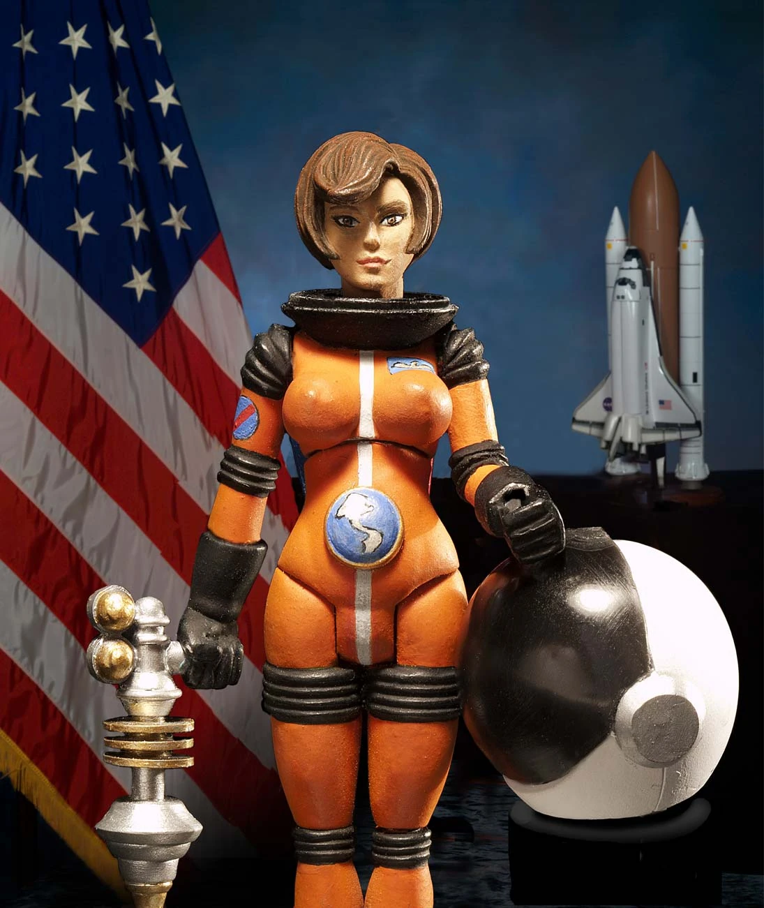 Production PVC Terra Firma - The Woman from Earth. White with Translucent Blue accessories. Glyos-compatible. Accessories: Removable 3-piece helmet, magnet jetpack/Anti-Gravity Generator, Atomic Disintegrator, alternate arms. First released at NYCC 2013 on October 10th - 13th, 2013. Bagged figure. Limited Edition. Sold as a set with Gamma-X and Jack Asteroid. $35 each 3 figure set or $11 for Terra Firma.