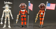 Production PVC Terra Firma - The Woman from Earth. Glow-in-the-Dark with Silver accessories. Glyos-compatible. Accessories: Removable 3-piece helmet, magnet jetpack/Anti-Gravity Generator, Atomic Disintegrator, alternate arms. Released on May 26th, 2018. Bagged figure. Limited Edition. Early orders from TheOuterSpaceMen.com included a bonus bag of glow-in-the-dark accessories. $25 each.